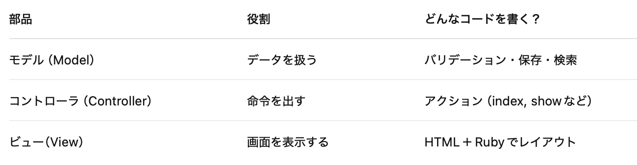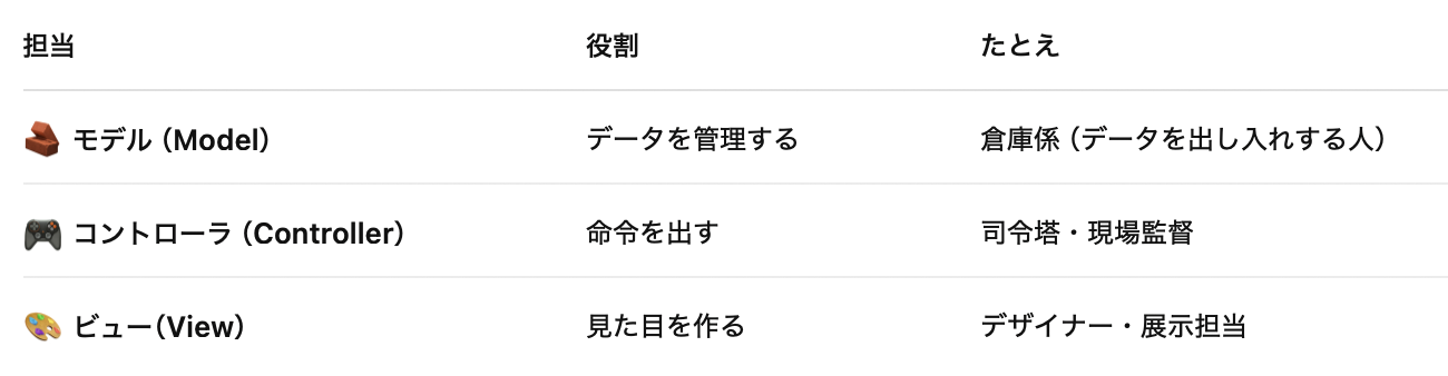 👩💻 ユーザー ↓ (クリック!) 🧭 ルーティング(入口で案内) ↓ 🎮 コントローラ(司令塔が命令を出す) ↓ 🧱 モデル(データを取りに行く・保存する) ↓ 🎨 ビュー(画面を表示) ↓ 🌐 ユーザーのブラウザに返る