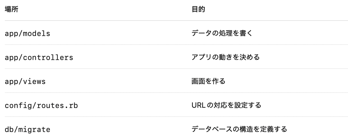 my_app/ ├─ app/ │ ├─ models/ ← データ(Model) │ ├─ controllers/ ← 司令塔(Controller) │ ├─ views/ ← 見た目(View) │ └─ helpers/ ← ビューを助けるメソッド(後で出てくる) │ ├─ config/ ← 設定ファイルたち(ルーティングなど) │ └─ routes.rb ← URLの入り口を管理 │ ├─ db/ ← データベース関連(migration, schemaなど) │ ├─ Gemfile ← 使うライブラリの一覧 └─ README.md ← プロジェクトの説明書